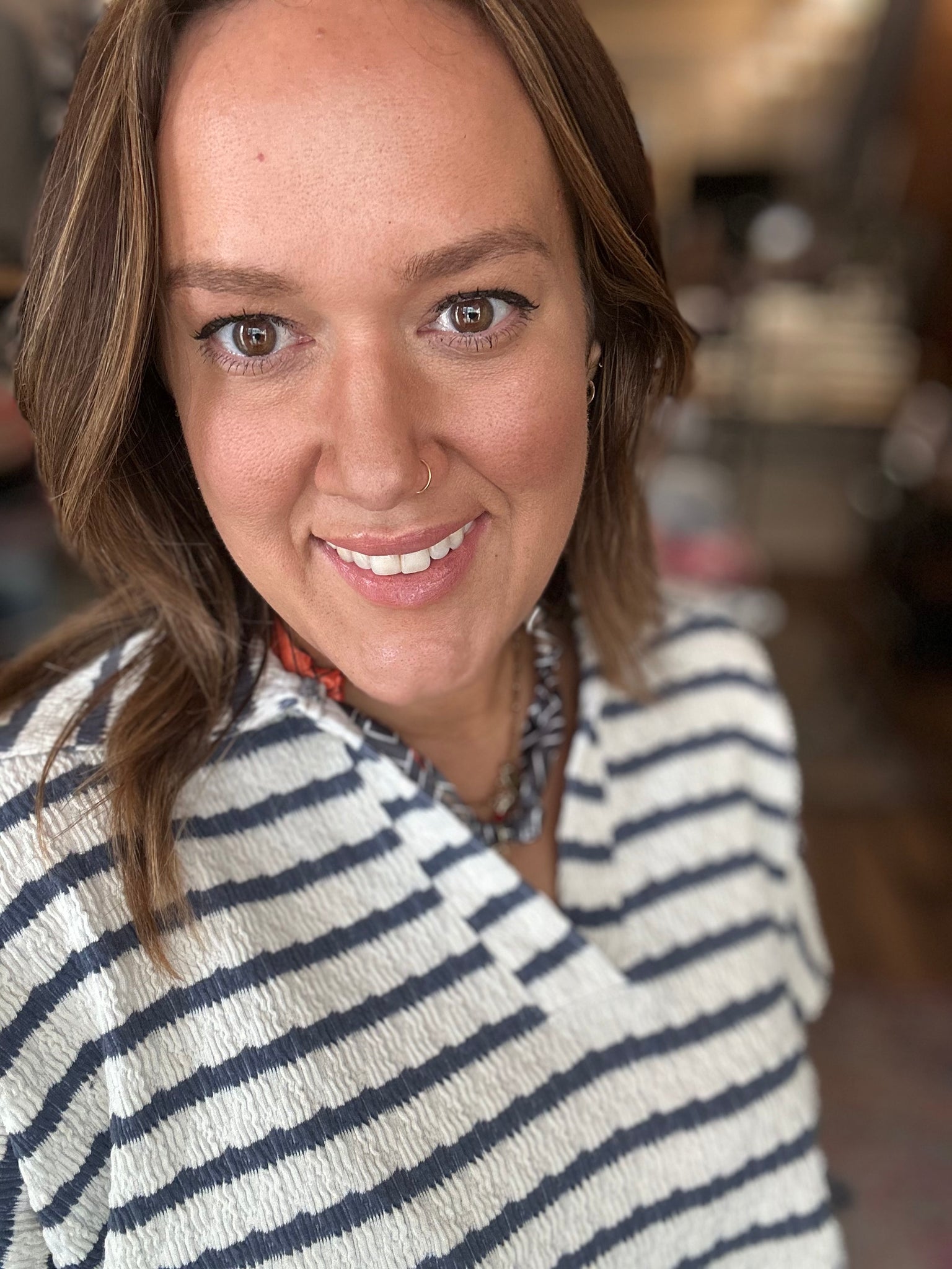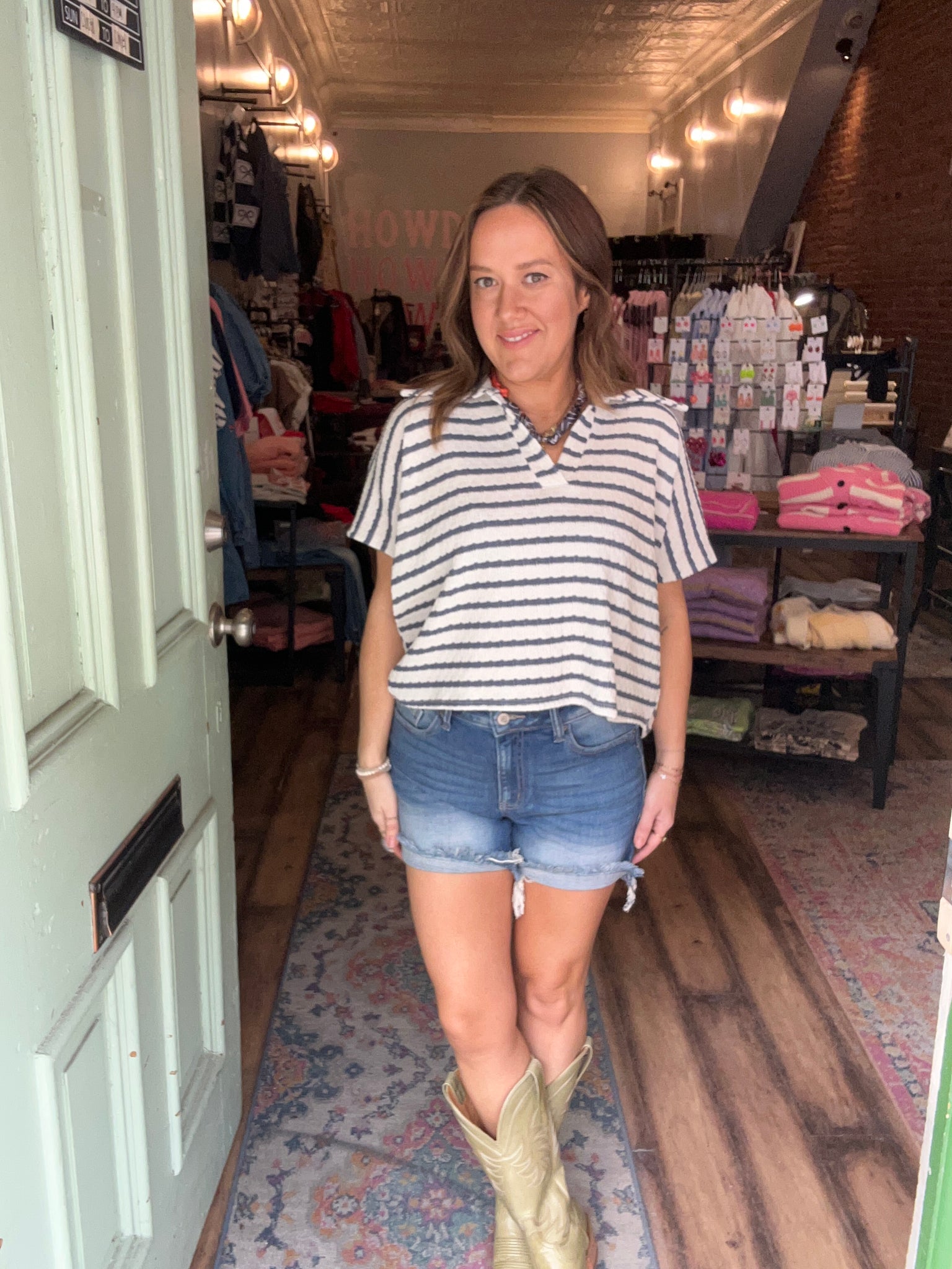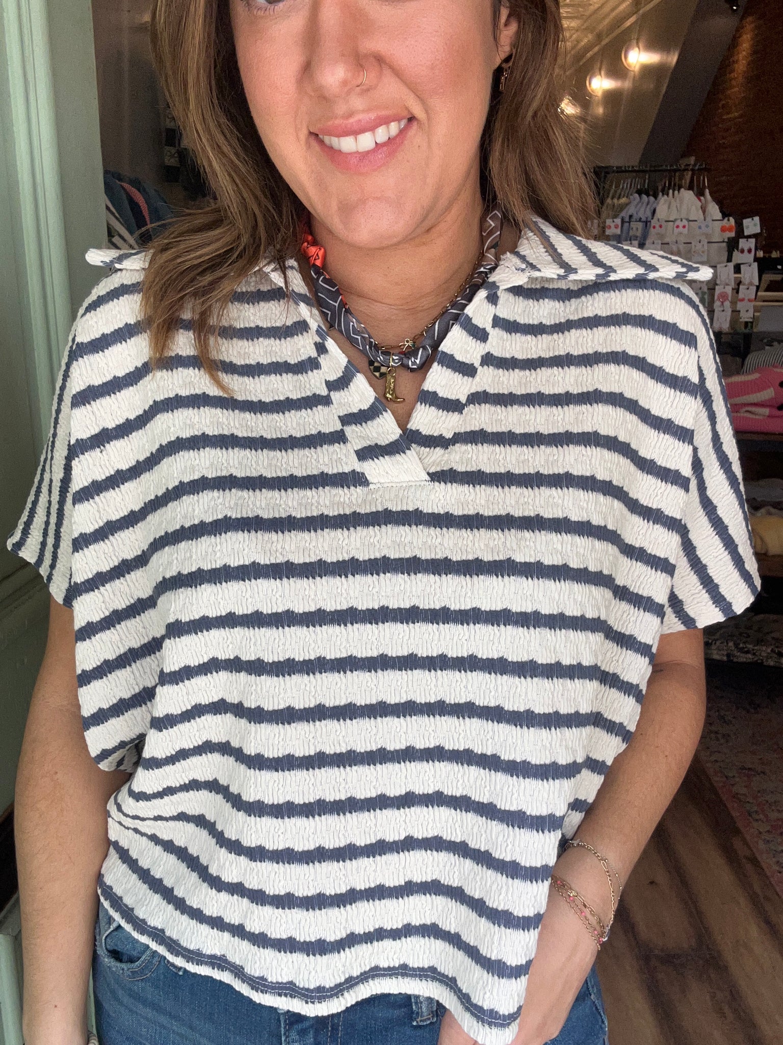 Striped split neck collar top